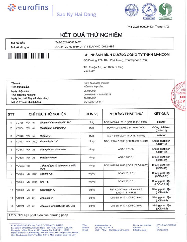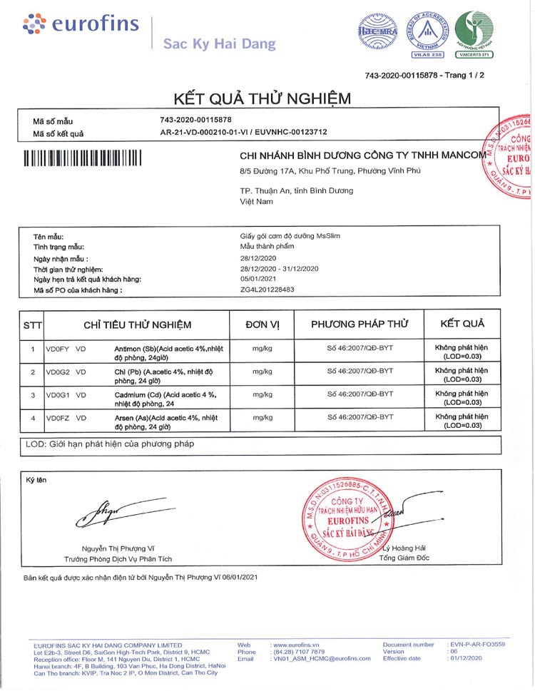 Kiểm nghiệm thành phần dinh dưỡng, giấy gói bởi Eurofins